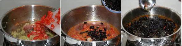 Rinse the beans and drain them. In a pot, add the oil, the chili (whole or in pieces), the chopped onion and garlic, the whole piece of smoked bacon, and the bay leaf; sauté everything over low heat and then add the diced tomato, cinnamon, and finally the black beans.