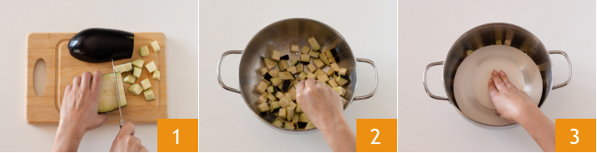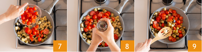 Add them to the eggplants 7, mix, adjust with salt and pepper 8, and cook for 5 minutes, stirring occasionally 9.