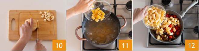 Cube the smoked scamorza 10 and start cooking the pasta in boiling salted water 11. When it is al dente, drain it and add it to the dressing 12.