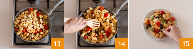 Add the cubes of scamorza 13, give a quick flick of the wrist, just enough for the cheese to start melting a bit 14, and you can finally plate. Your mezze maniche with eggplants and smoked scamorza are ready to be enjoyed with a bit of torn basil on each plate 15.