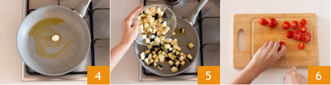 After this time, heat a swirl of oil in a pan with a peeled clove of garlic 4, add the eggplants and let them cook over medium heat for 6-7 minutes 5. Meanwhile, cut the cherry tomatoes into quarters 6.