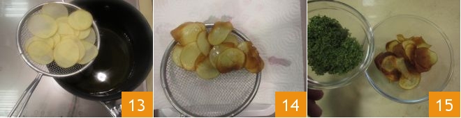 Next, heat plenty of oil in a large pot and immerse the chips when the oil reaches 340°F 13, let them brown for a couple of minutes, then drain on a paper towel 14. Garnish with the mix and set aside 15.