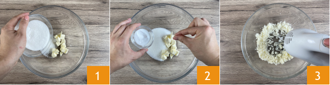 To make the milk biscuits, place the softened butter in pieces and sugar in a large bowl 1. Add a pinch of salt 2 and mix for a few moments: you will get a crumbly consistency 3. Do not mix for too long to avoid overheating the butter.
