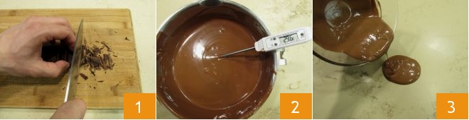 To prepare the milk chocolate and hazelnut Easter egg, start with the How to temper: chop the milk chocolate 1, then melt it in a double boiler (the water in the pot should reach just below the bottom of the bowl where you've placed the chocolate); measure the chocolate temperature with a kitchen thermometer 2 and when it reaches 113-122°F, pour 2/3 of it onto the marble slab placed on a work surface (keep the pot with hot water aside) 3; the marble slab serves to bring the chocolate quickly to the desired temperature and is essential for achieving an excellent result.