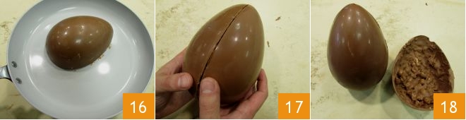 Heat a pan about 9 inches in diameter (larger than the egg) and then place it on the work surface. Place one egg half at a time with the edges adhering to the bottom of the pan: hold for a few moments, just enough to slightly warm the edges 16; insert the surprise then join the two halves 17. Hold for a few minutes to perfectly seal the halves and close the egg. Your milk chocolate and hazelnut Easter egg is ready to be gifted and enjoyed on Easter.