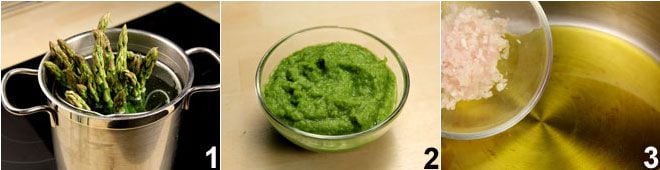 To prepare mimosa risotto, start by thoroughly cleaning the asparagus (click here for the procedure) and immerse them in a pot of lightly salted boiling water 1 for 5-10 minutes (depending on the size of the asparagus). Drain the asparagus, cut off the tips, which you will set aside whole, and blend the remaining soft green part 2; Meanwhile, in a pan, sauté the shallot with half a cup of extra virgin olive oil 3.