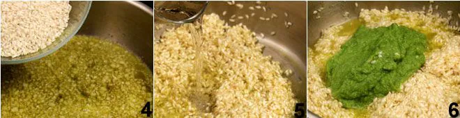 Add the rice to the shallot 4 and toast it over high heat, then pour in the glass of white wine 5, letting it evaporate well. Add the asparagus cream 6.