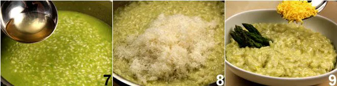 Gradually add a ladle of broth to the rice 7 each time it starts to dry out too much. A few moments before the end of cooking, add the stracchino cheese, allowing it to blend well with the rice, then remove from the heat and stir the risotto with butter and Grana Padano cheese 8, seasoning with pepper and adjusting the salt if necessary. Place the rice on a serving plate and complete the presentation by decorating your mimosa risotto with the asparagus tips set aside earlier and crumbling (using a vegetable mill or a garlic press) the hard-boiled egg yolk in the center of the plate 9.