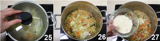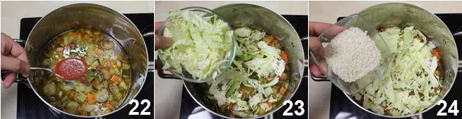 After this time, add the tomato sauce 22, the cabbage 23, and the rice 34.