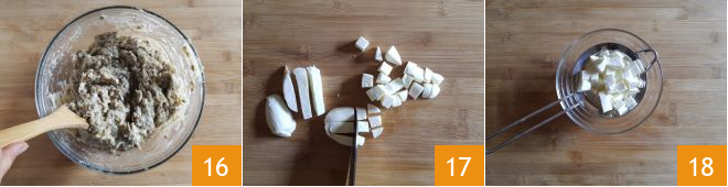 Lightly pepper and mix well 16. Cut the mozzarella into cubes 17 and place them in a sieve to drain excess liquid 18.