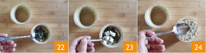 Add a little cooked spinach 22 and continue with 4 or 5 mozzarella cubes 23. Finally, cover with the lentil and potato mixture, pressing with the back of the spoon 34.