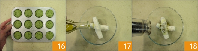 Once cooked, take the muffins out of the oven and let them cool 16. In the meantime, prepare the goat cheese cream by pouring the cheese, a drizzle of oil 17, salt, and pepper 18 into a bowl.