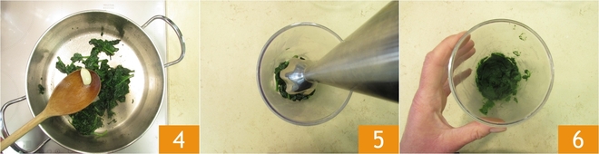 Cook for 5 minutes over high heat, stirring until wilted. Remove the garlic 4, transfer the cooked spinach to a tall glass, and blend with an immersion blender 5. Set aside the obtained cream 6.