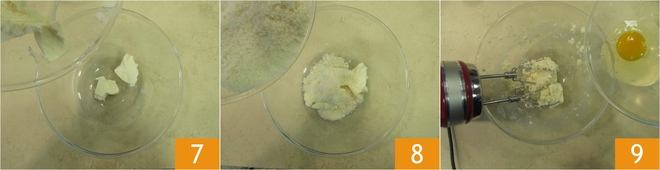 In a bowl, add the softened butter 7 and grated cheese 8. Work the ingredients with electric whisks for about 2 minutes. Add the egg to the mixture 9, and mix until fully absorbed.