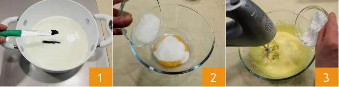 Remove the vanilla pod from the heated milk and add the yolk mixture 4. Turn on the gentle heat again and stir continuously with a whisk to thicken the mixture 5. When the cream is well thickened, turn off the heat and pour it into a low, wide dish; cover it immediately with contact plastic wrap so that an annoying crust does not form 6; then let it cool first at room temperature and then in the refrigerator.
