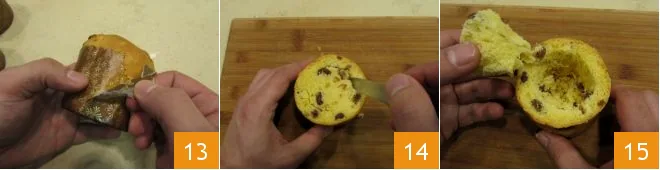 Take the mini panettones and carefully remove the paper wrapping around them 13, being careful not to damage their surface. Cut off the top caps and with a small knife hollow out the inside of the mini panettones (staying about 1/2 inch from the outer edges) 14, then extract the dough 15, which you will cut into discs to form the layers to alternate with the cream.