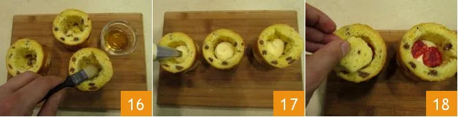 Lightly brush the mini panettones with Grand Marnier (or another fruity liqueur such as Maraschino or Cointreau) 16. Using a piping bag, place about 1/2 inch of diplomatic cream on the base 17. Then place 2 raspberries on each mini panettone and place a disc of mini panettone on top of them 18 and cover again with the diplomatic cream.