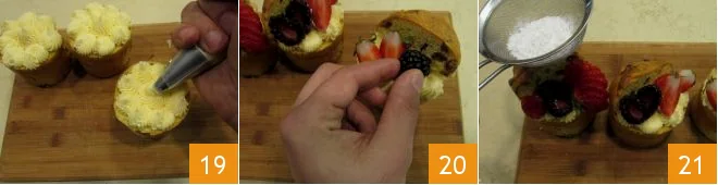 Garnish the top by decorating with tufts of cream 19; cut the caps you had set aside in half lengthwise and place them on the mini panettone, while the other half can be decorated with the fruit to be divided for each filled mini panettone 20. Sprinkle with powdered sugar 21 and your mini panettones filled with cream and fruit are ready to be enjoyed!
