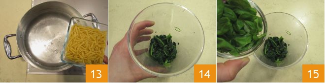 As soon as the water starts to boil, cook your mini penne 13, following the cooking times indicated on the package. Transfer the still warm spinach into a blender cup 14, add the basil leaves 15,