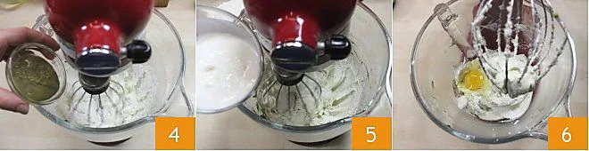 also add the pistachio paste 4, yogurt 5, the eggs one at a time 6, and a pinch of salt. When the eggs have been incorporated into the mixture