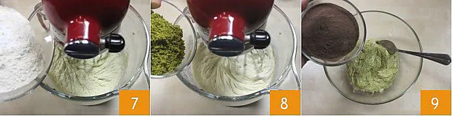 also add the sifted flour and baking powder 7 and the chopped pistachios 8; let everything blend until you get a thick and homogeneous mixture. If you don't have a stand mixer, you can use a whisk to mix, being careful to add the ingredients little by little to avoid lumps. Now prepare the Nesquik heart: take 100 g of dough and put it in a separate bowl, add the Nesquik 9 and mix it with the pistachio mixture until you get a homogeneous dough.
