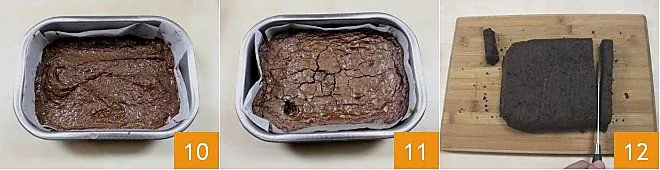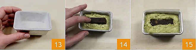 Line a rectangular baking pan of 6x4 inches with parchment paper and pour in the pistachio and Nesquik mixture, leveling it well with a spatula 10. Bake in a preheated static oven at 340°F for 20 minutes (or in a convection oven at 300°F for 15 minutes). The result should be a very soft and moist cake inside with a crispy crust 11. Let the cake cool (to facilitate cutting, you can put it in the refrigerator for 20 minutes) and then cut it into sticks of 2.5x0.75 inches 12: in this way, you will have obtained the heart of your mini plumcakes.