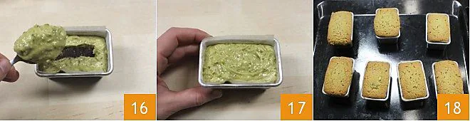 and cover everything up to the edge with more pistachio mixture (16-17). Bake in a preheated static oven for 35 minutes at 340°F (or in a convection oven for 25 minutes at 300°F) until the surface of the plumcakes begins to turn golden 18. Remove the mini pistachio plumcakes with Nesquik heart from the oven, let them cool slightly, and enjoy!