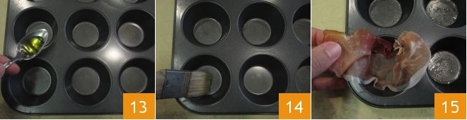 Grease a 34 mini muffin mold with olive oil (a 12 mini muffin mold will also work, and you can then prepare a second batch) 13, brush thoroughly 14, take the slices of speck and cut them in half to line each cavity with each half 15; squeeze the batter into each space up to 3/4 full 15.