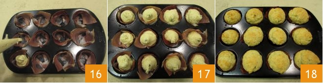 squeeze the batter into each space up to 3/4 full 16. Once the tray is filled 17, bake the mini muffins in a preheated static oven at 350°F for 25 minutes (before taking them out, check that they are well browned on the surface). At the end of cooking, remove the mini savory ricotta and speck muffins from the oven and let them cool slightly before serving 18.