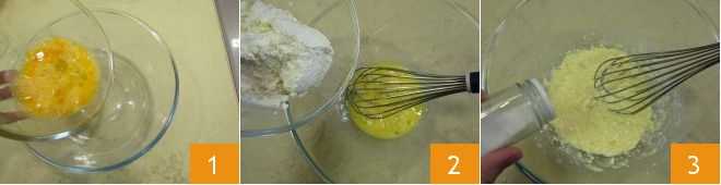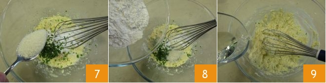 Now incorporate the grated Grana cheese 7 and, gradually, add the flour little by little, alternating with the seed oil (8-9).