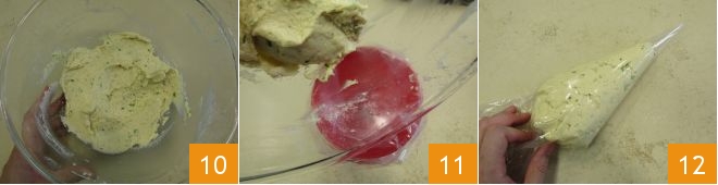 Mix the mixture well 10. Once ready, transfer the batter into a disposable pastry bag (11-12).