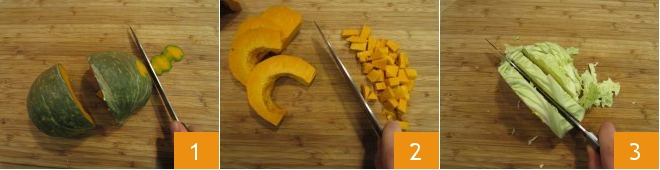 To prepare the mini savory puff pastry angelicas, first clean the pumpkin 1. Then cut it into slices and then into cubes 2; in total you will obtain 190 g (about 6.7 oz). Also slice the cabbage 3