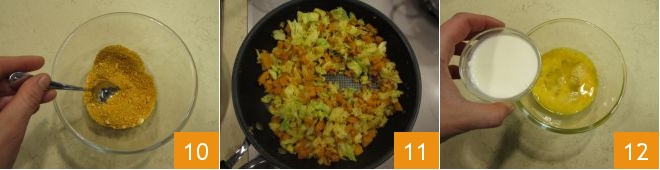Stir with a teaspoon until you get a homogeneous mixture 10, then set aside. As soon as the vegetables are cooked, turn off the heat and let them cool completely 11. In another bowl, break the egg, add the cream (or milk) 12 and beat it all together.