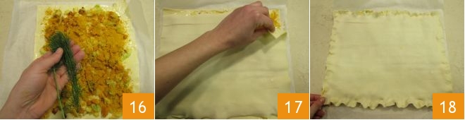 Add a pinch of black pepper and also the fennel by breaking it into small pieces 16 and spreading them everywhere. Cover with the second sheet of puff pastry 17 and seal the edges by pinching them with your fingers 18.