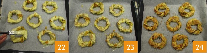 Cut out a strip about 1.18 inches (3 cm) wide 19, roll it from one end to the other 20, close it to form a small ring 21 and transfer it to a baking sheet lined with parchment paper.