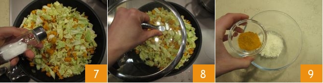 Add a pinch of salt 7 and cover with a lid 8. Let it cook for about ten minutes and in the meantime mix the Grana Padano and turmeric in a small bowl 9.