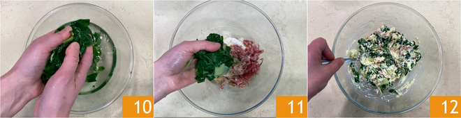 Drain and thoroughly squeeze the chard 10, then add it to the bowl 11. Mix to combine the ingredients 12.