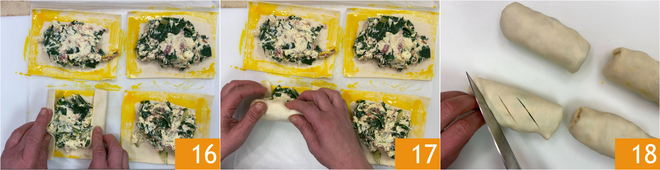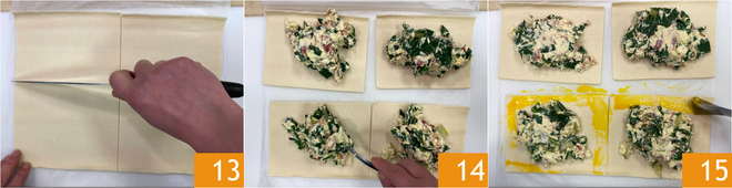 Cut the puff pastry into 4 rectangles of about 4x6 inches 13. Place a little filling in the center of the rectangles 14, then brush the edges with a beaten egg yolk 15.