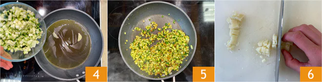 To prepare the mini zucchini and cheese plumcakes, first trim the ends of the zucchini and cut them first into strips 1 and then into cubes of about 0.2 inches 2. In a pan, flavor the oil with a clove of garlic 3.
