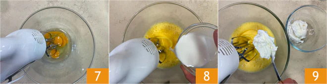 Move on to preparing the batter: crack the eggs into a bowl and whip them with an electric mixer 7 until they become foamy. While keeping the mixer on, slowly pour in the milk 8, then add the yogurt 9.