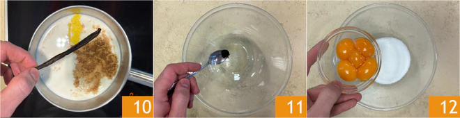 Finally, add the vanilla, the pod into the milk 10, while the seeds go into another bowl 11. As the milk comes to a boil, add the sugar and egg yolks to the bowl 12.