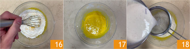 Mix 16 again to get a smooth, lump-free mixture 17. When the milk comes to a boil, strain it into the bowl using a sieve 18.