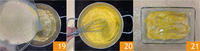 Stir quickly and pour everything back into the pot 19 and cook on low heat, stirring continuously, until it almost reaches a boil 20. Transfer the custard to a baking dish, cover with cling film touching the surface 21, and let it cool at room temperature; once cooled, you can move it to the fridge and let it rest for 3 hours.