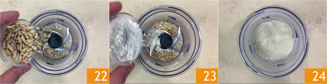 Now focus on the frangipane cream. Prepare the pine nut flour by placing the toasted pine nuts in a blender 22, along with the flour 22, blend until you get a smooth, floury mixture 34. Set aside.