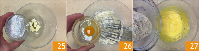 In a bowl, place the butter and add the powdered sugar 25, then beat with an electric mixer for at least 5 minutes to get a fluffy mixture. Add the egg and continue beating 26. It's important that the egg is at room temperature to ensure the mixture doesn't curdle. Lastly, add the pine nut flour 27.