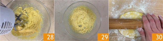 Continue mixing 28 until the flour is absorbed into the mixture 29. Take the shortcrust pastry and knead it first by hand to restore elasticity, then with a rolling pin. On a lightly floured work surface, roll out a circular sheet about 1/8 inch thick 30.