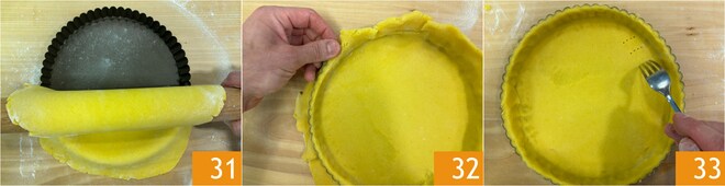 Transfer the pastry to a 9-inch diameter cake pan, previously buttered 31. Trim the excess by pressing with your fingers or using a small knife 32 and prick the bottom with a fork 33.