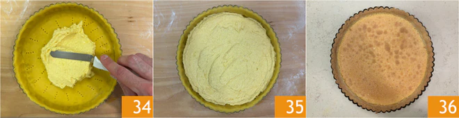 Fill with frangipane cream 34 and smooth it out 35. Bake in a static oven at 350°F for about 30 minutes, on the lowest rack of the oven. Remove from the oven and let it cool completely 36.