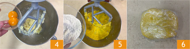 Add the egg yolks 4 and mix. Then add the flour 5 and mix again until you get a compact dough. Transfer the dough to a work surface, form it into a disc, wrap it in plastic wrap 6, and let it rest in the fridge for at least 3 hours.