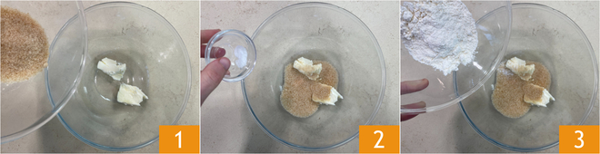 To prepare the mon sciù di pastiera, start with the craquelin: first, take the butter out of the fridge about 30 minutes before starting the recipe, so it has a soft and spreadable consistency. In a bowl, combine the plastic butter, brown sugar 1, salt 2, and flour 3.